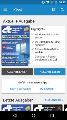 Εξερευνήστε τις δυνατότητες της εφαρμογής c't σήμερα και απολαύστε δωρεάν μια πλήρη έκδοση c't, καθώς και ένα ειδικό τεύχος ως δείγμα, για να πάρετε μια γεύση από την ποιότητα και το βάθος του περιεχομένου μας. Ως υπάρχων συνδρομητής c't Plus ή c't Digital, έχετε πλήρη, απεριόριστη πρόσβαση σε όλο το περιεχόμενο της c't, χωρίς επιπλέον κόστος, απευθείας από την κινητή σας συσκευή. Απλά συνδεθείτε στην ενότητα "Login" του μενού της εφαρμογής, χρησιμοποιώντας τα στοιχεία του λογαριασμού σας στην online υπηρεσία συνδρομών, και συνεχίστε την ανάγνωση από όπου κι αν βρίσκεστε.