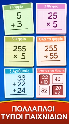 Είτε το παιδί σας βρίσκεται στα πρώτα του βήματα με τους αριθμούς είτε αναζητά ενισχυμένες προκλήσεις, το **Μαθηματικό Παιχνίδι** προσαρμόζεται τέλεια. Με ποικίλες επιλογές δυσκολίας, από απλές ασκήσεις "συν και πλην" μέχρι απαιτητικούς πολλαπλασιασμούς και διαιρέσεις, καλύπτει τις ανάγκες μαθητών από το νηπιαγωγείο έως και την έκτη δημοτικού, αλλά και μεγαλύτερων που επιθυμούν να εξασκήσουν το μυαλό τους. Η εφαρμογή είναι ένας θησαυρός από παιχνίδια αριθμών, παιχνίδια πρόσθεσης και πολλαπλασιασμού, δημιουργώντας ένα φιλικό και χωρίς περισπασμούς περιβάλλον, ιδανικό για αβίαστη μάθηση.